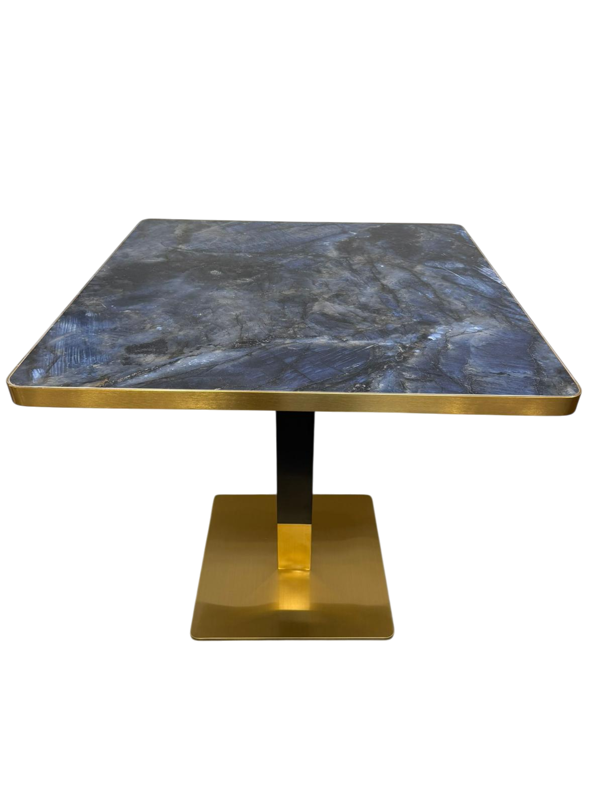 Características: Tablero de piedra sintetizada efecto marmol color blue moon de 4cm de grosor, con canto en color oro de metal (opcional). Disponible en cualquier medida y forma, con pie en color negro, negro y dorado, dorado o color óxido.