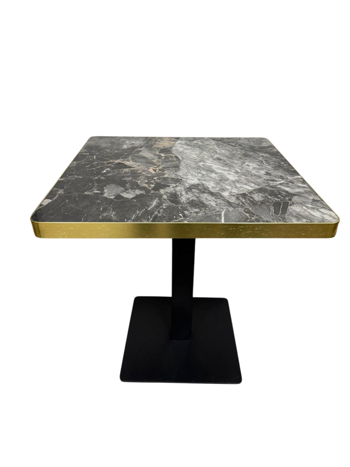 Características: Tablero de piedra sintetizada efecto marmol negro de 3cm de grosor, con canto en color oro de metal (opcional). Disponible en cualquier medida y forma, con pie en color negro, negro y dorado, dorado o color óxido.