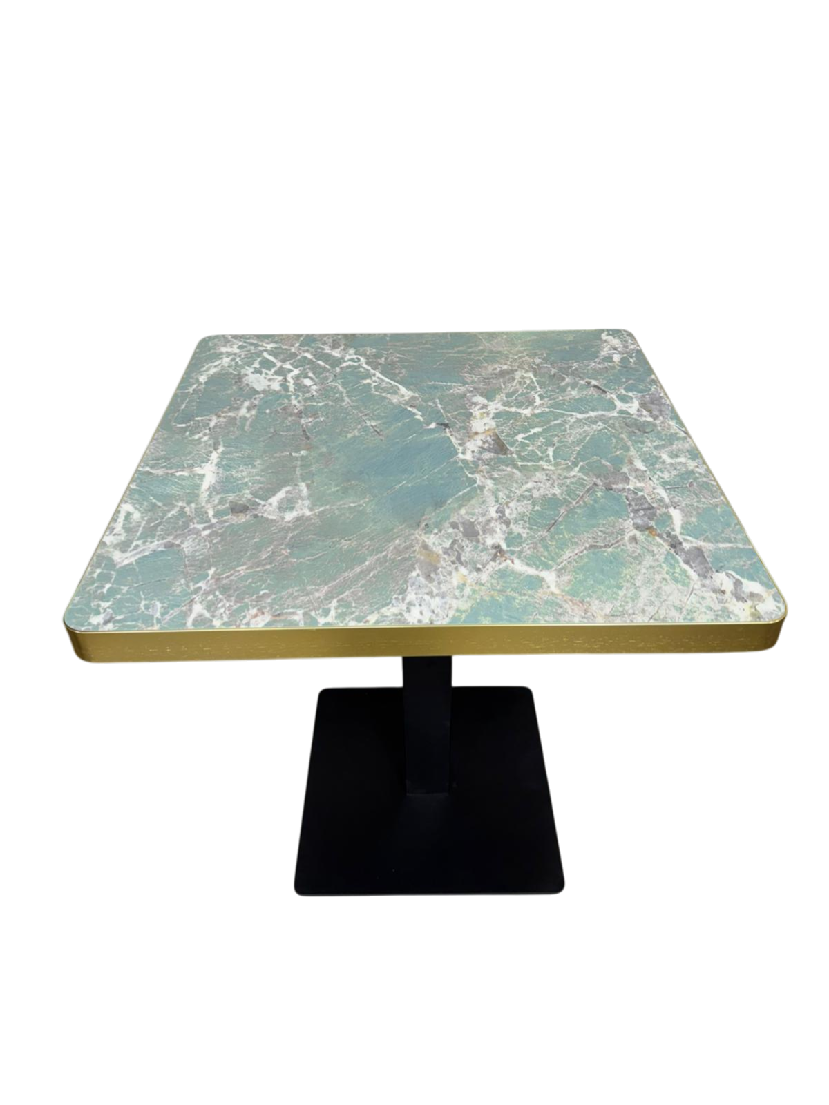 Características: Tablero de piedra sintetizada efecto marmol verde agua de 4cm de grosor, con canto en color oro de metal (opcional). Disponible en cualquier medida y forma, con pie en color negro, negro y dorado, dorado o color óxido.