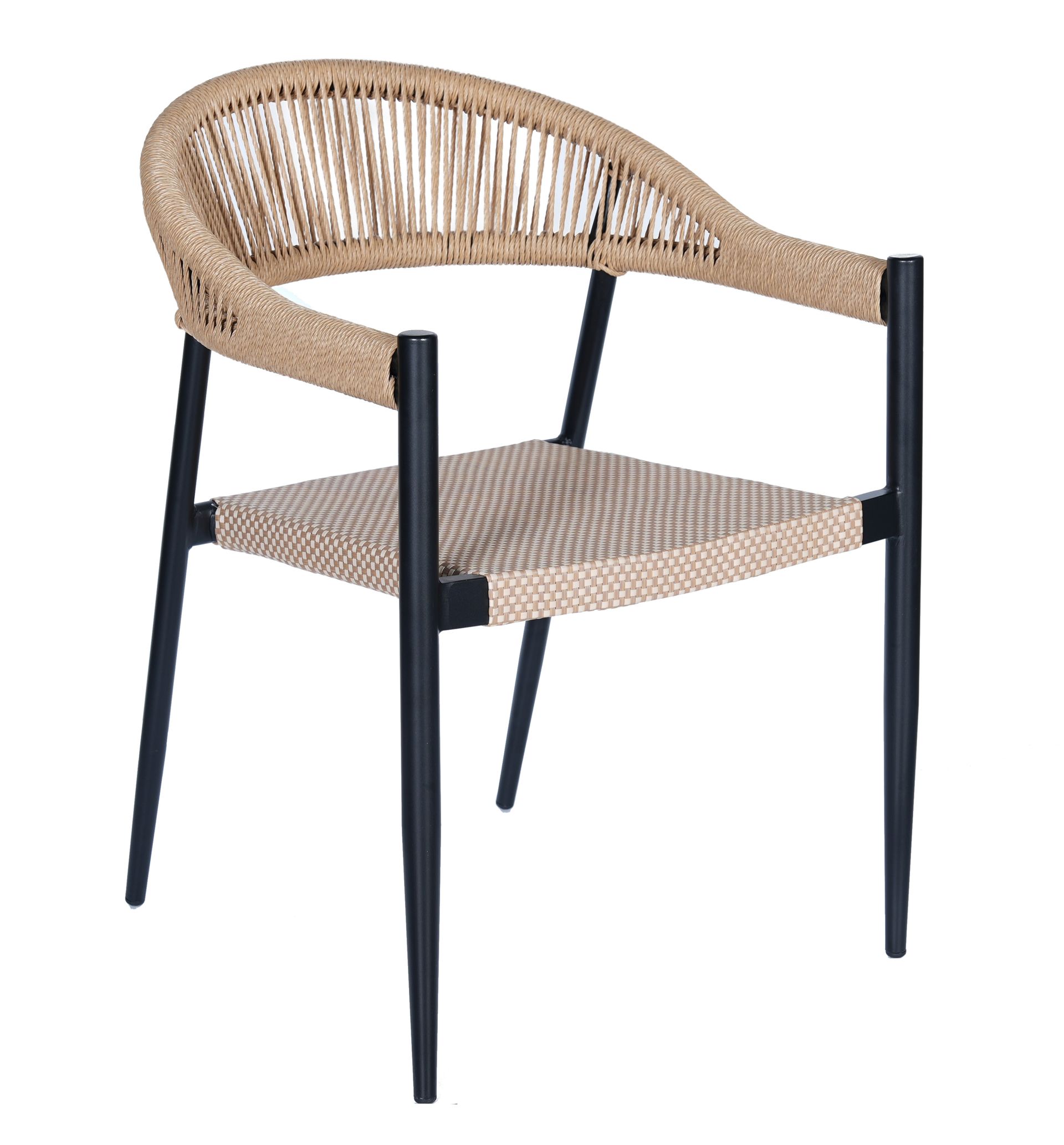 Características: Silla apilable con estructura de aluminio en color negro, con material revestido de cuerda en color beige.