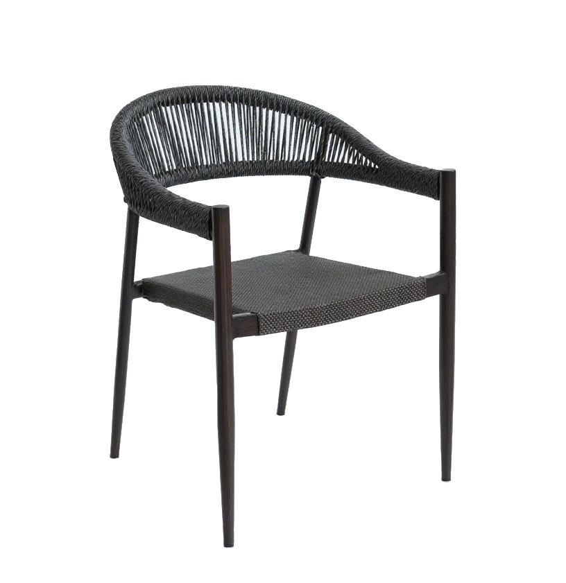 Características: Silla apilable con estructura de aluminio en color negro, con material revestido de cuerda en color negro.