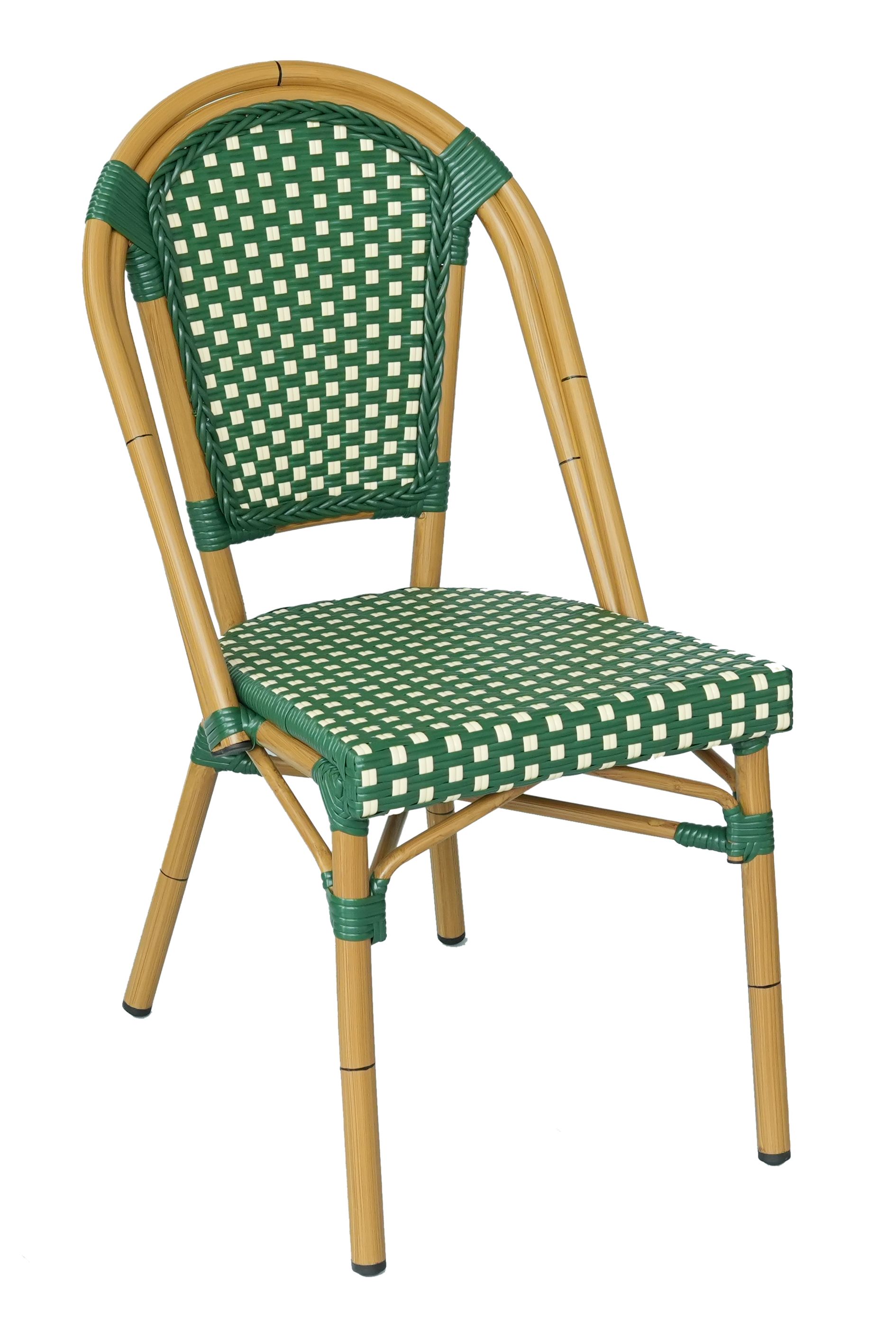 Silla apilable con estructura de aluminio, revestimiento epoxi efecto madera y con tejido de mimbre sintético.