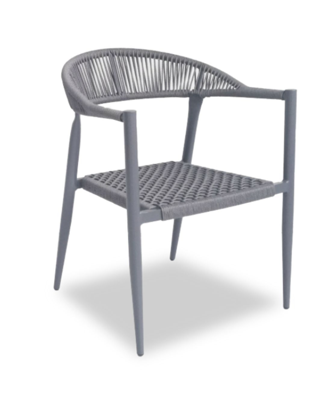 Características: Silla apilable con estructura de aluminio en color gris, con material revestido de cuerda en color gris.